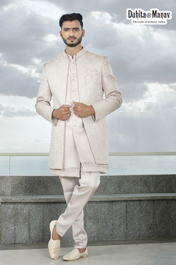 Color: Light Grey | Work: Intricate Embroidery on Jacket | Set Includes: Sherwani Jacket, Kurta, and Bottom Wear |Style: Contemporary royal ethnic wear | Closure: Buttoned front with traditional detailing | Care: Dry clean only