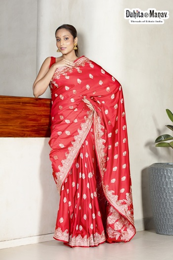 Embrace timeless elegance with this traditional red Banarasi silk saree from Duhita Manav. Beautifully woven with intricate patterns, it reflects rich heritage and is perfect for weddings and festive occasions.