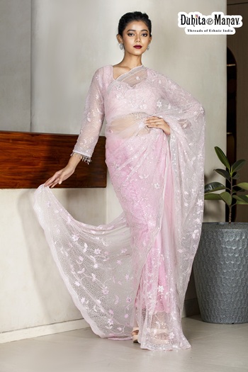 Step into elegance with this stunning pink net saree from Duhita Manav, beautifully adorned with intricate thread work, delicate beads, and shimmering sequin embellishments. Perfect for adding a touch of glamour to your festive and party looks.