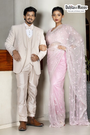 Exude elegance as a couple with this refined ensemble from Duhita Manav. The sophisticated beige three-piece suit pairs seamlessly with a graceful light pink embellished saree, creating a perfect balance of modern style and traditional charm for special occasions.