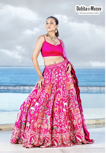 Make a striking statement with this vibrant fuchsia pink lehenga set from Duhita & Manav. Featuring an intricately embroidered skirt with detailed traditional motifs, a matching sleeveless blouse, and a sheer dupatta, this ensemble reflects luxurious craftsmanship inspired by royal heritage designs.