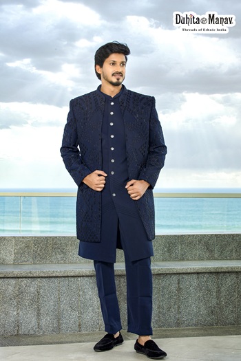 Elevate your ethnic style with this navy blue Indo-Western suit set from Duhita Manav. Featuring a structured jacket paired with tailored pants, this ensemble blends contemporary tailoring with traditional elegance—perfect for weddings and festive occasions.