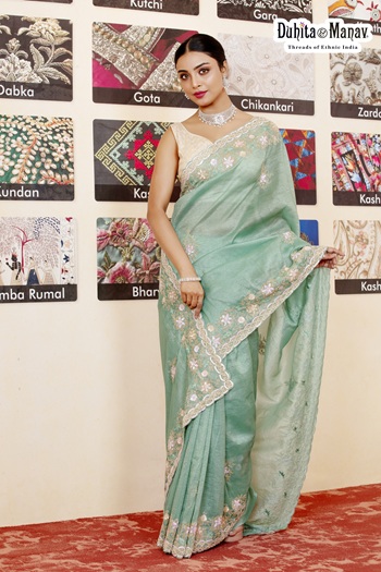 Refresh your ethnic wardrobe with this elegant light green designer saree from Duhita Manav, beautifully enhanced with intricate embroidery. Its soothing hue and graceful drape make it perfect for festive occasions and special gatherings.
