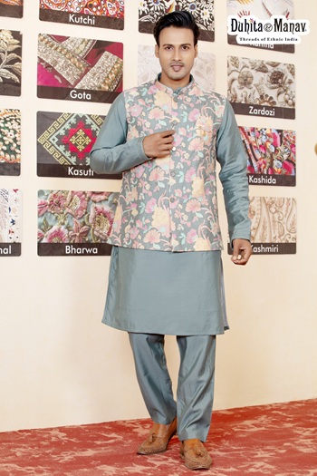 Brand: Duhita Manav | Fabric: Jacquard (Jacket), Cotton/Silk Blend (Kurta), Suiting Fabric (Trousers) | Work: Woven Jacquard Pattern on Jacket | Set Includes: Nehru Jacket, Kurta & Trousers | Occasion: Festive Wear, Wedding Functions, Cultural Events
