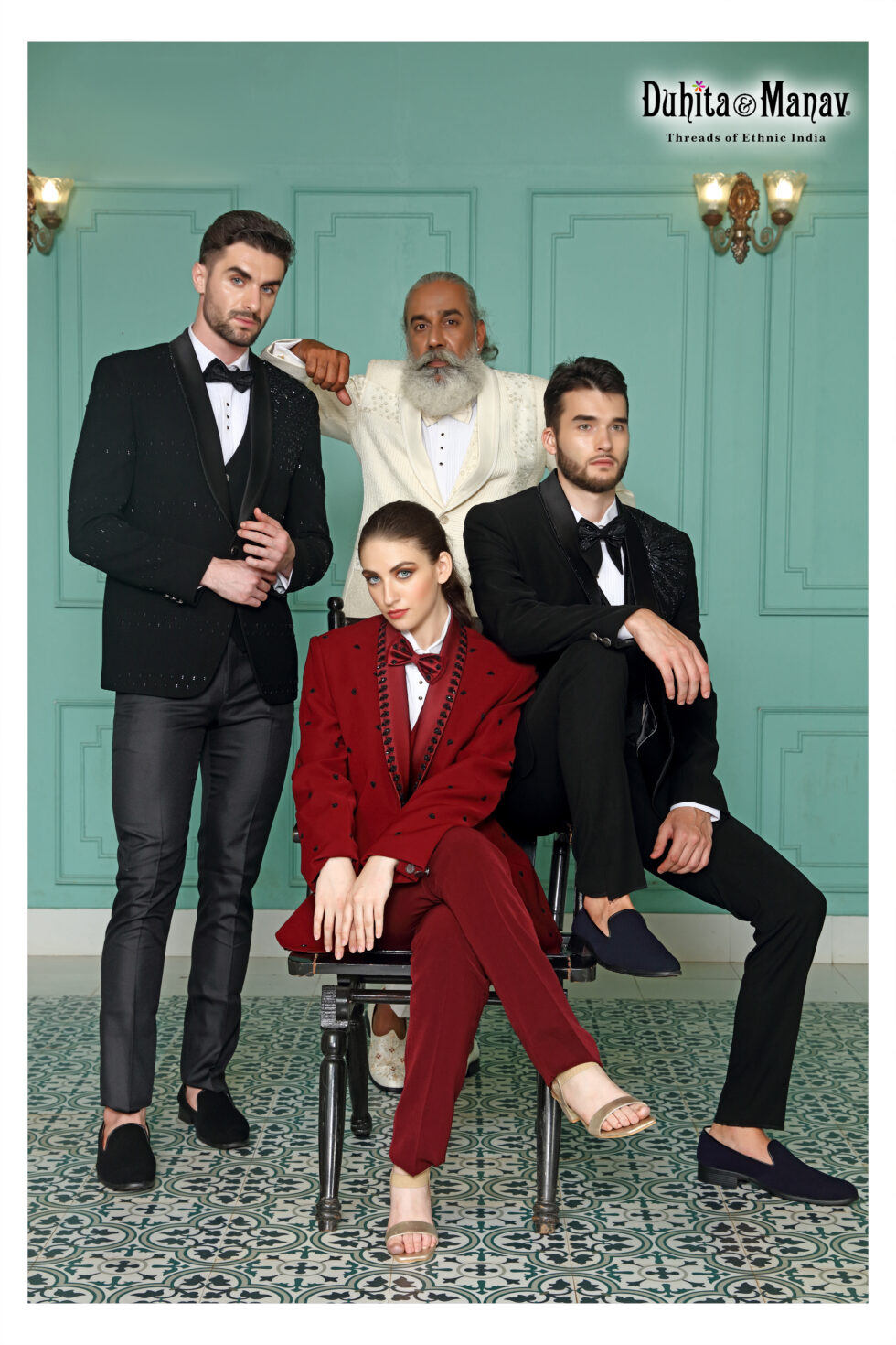 Kanjivaram Saree with Teal Blue Tuxedo Couple Ensemble