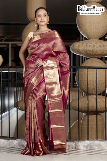 Radiate elegance in this exquisite rose gold Kanjivaram saree from Duhita Manav, highlighted by a luminous zari border. Its soft sheen and rich craftsmanship make it a perfect choice for weddings and grand celebrations.