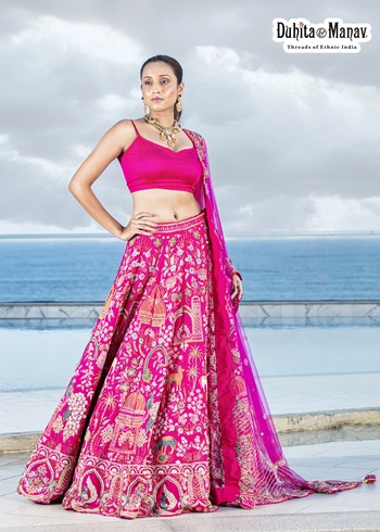 Make a striking statement with this vibrant fuchsia pink lehenga set from Duhita & Manav. Featuring an intricately embroidered skirt with detailed traditional motifs, a matching sleeveless blouse, and a sheer dupatta, this ensemble reflects luxurious craftsmanship inspired by royal heritage designs.
