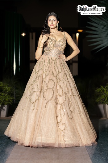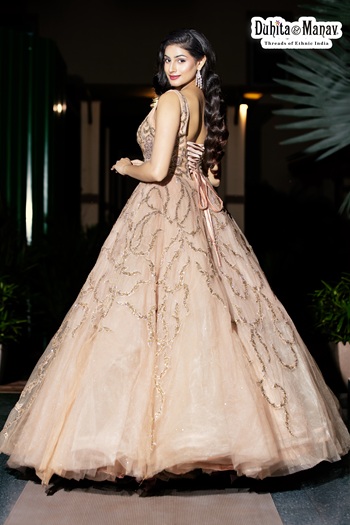 Brand: Duhita Manav | Color: Peach | Work: Intricate Hand Embroidery with fine detailing | Silhouette: Ball Gown | Occasion: Bridal Wear, Reception, Engagement, Evening Events | Style: Modern bridal with a royal, princess-inspired look | Fit: Tailored / Custom Fit